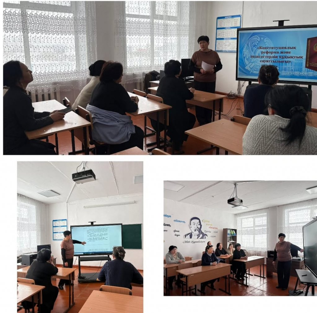 Бүгін, яғни 17 ақпанда "Конституциялық реформа және педагогтардың құқықтық сауаттылығы" тақырыбына әріптестермен конституциялық құқық туралы сұрақ -жауап әдісі арқылы талқыланды.